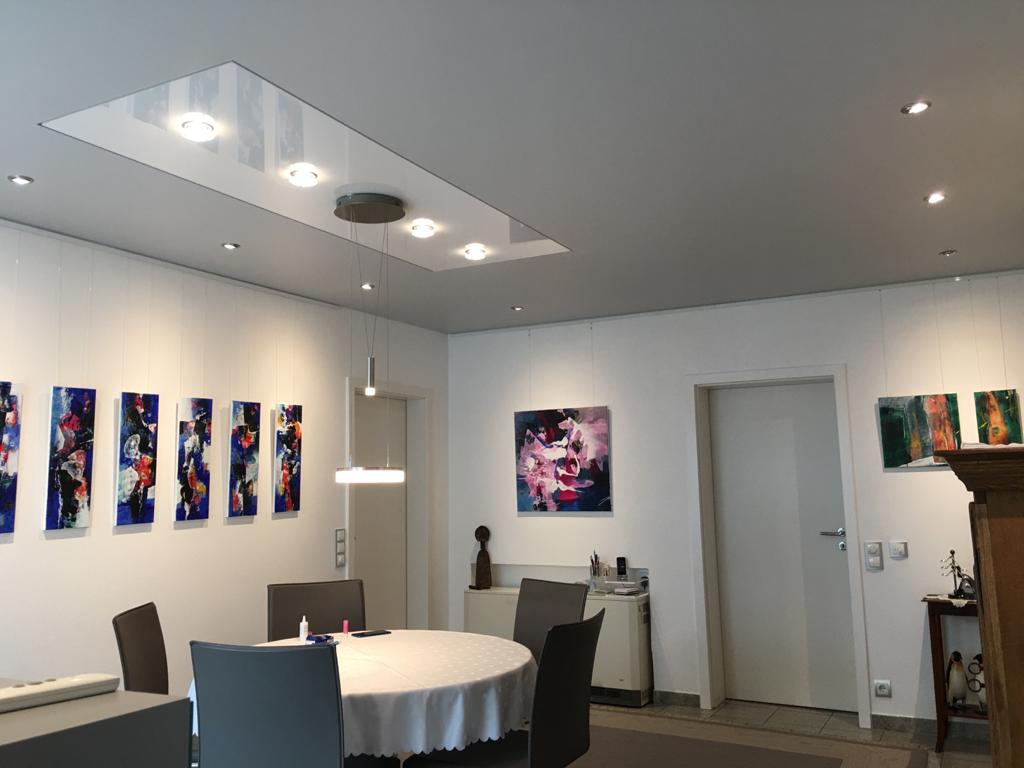 Stimmungsvolle Lackdecke mit eingearbeiteter rautenförmiger Lichtdecke im Esszimmer.