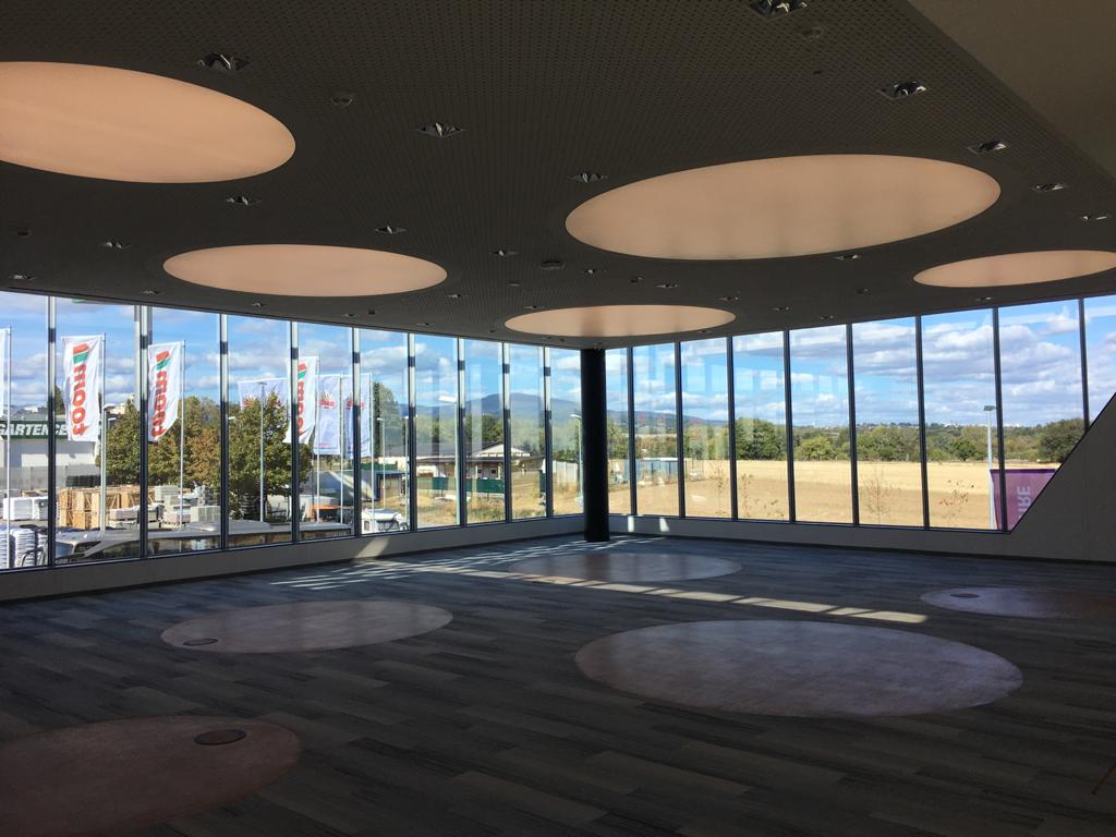 Eine lichte Herausforderung: Runde Lichtelemente mit einem Durchmesser von 3,30m eingelassen in einer gemachten Rigipsdecke.