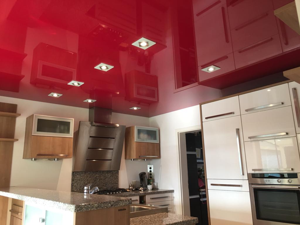 Was für eine Wirkung, da macht kochen doch noch mehr Spaß. Weinrote Lackdecke mit satinierten Glaslampen.